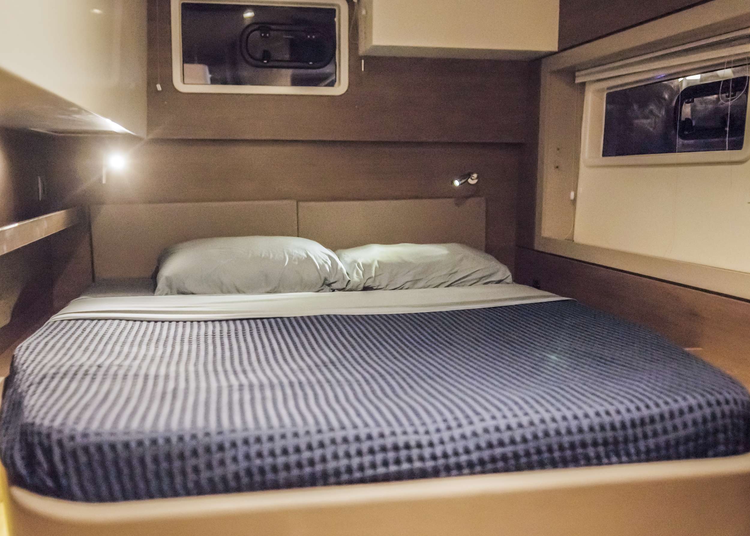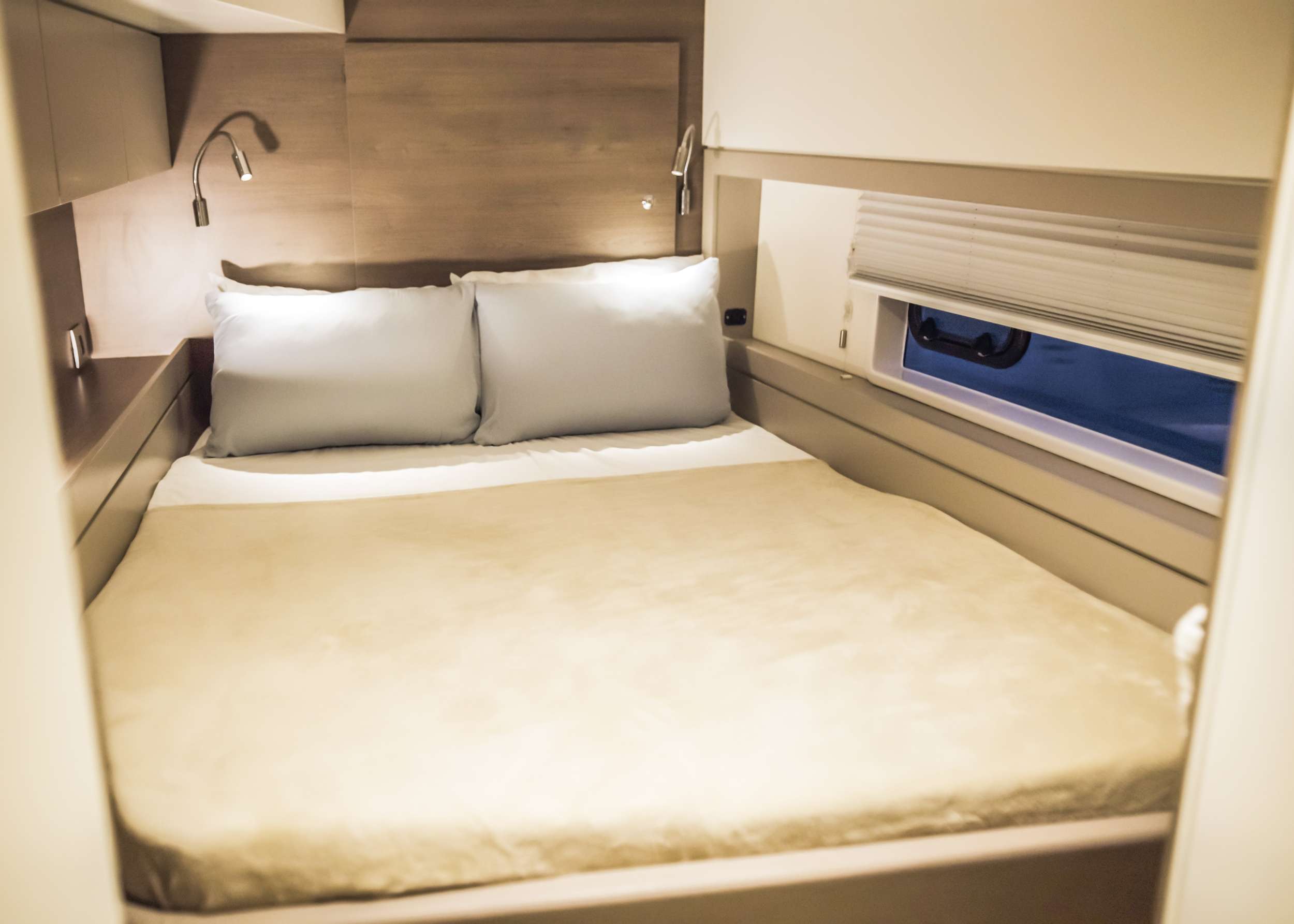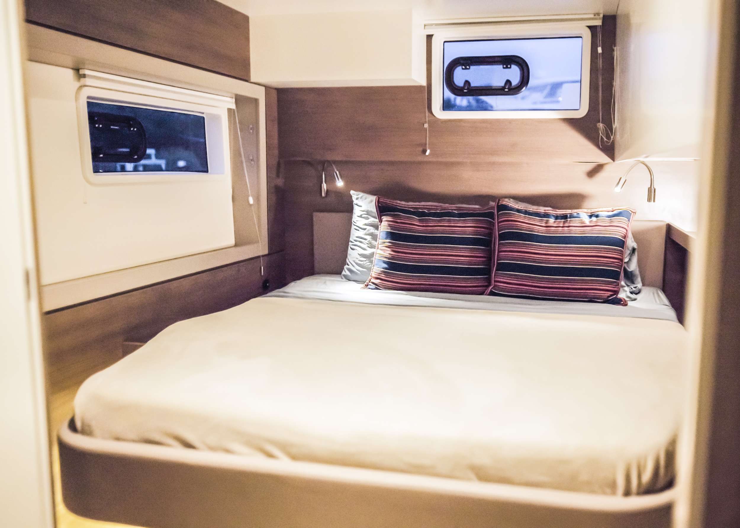 The yacht’s airy, open-concept layout flows seamlessly from bow to stern, with panoramic windows connecting the saloon to the cockpit. Indoor and outdoor spaces blend effortlessly, creating a breezy, inviting environment perfect for sailing days and relaxed evenings.