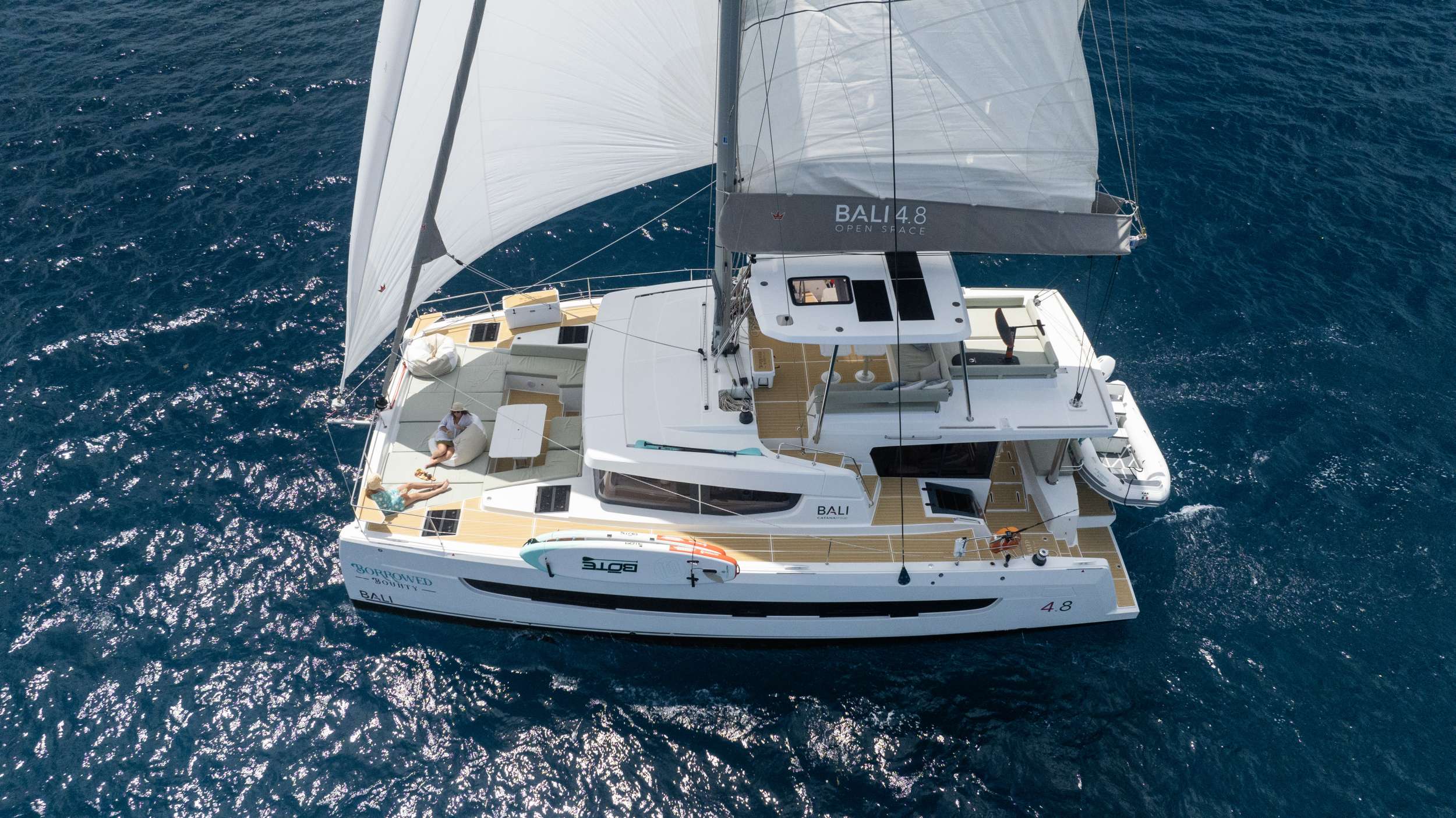 BORROWED BOUNTY is a modern and spacious Bali 4.8 catamaran, perfectly suited for a luxury British Virgin Islands crewed yacht charter. Designed around Bali’s signature concept of open, flowing spaces and effortless indoor-outdoor living, she accommodates up to 8 guests in 4 comfortable ensuite cabins, offering a relaxed yet refined Caribbean cruising experience.