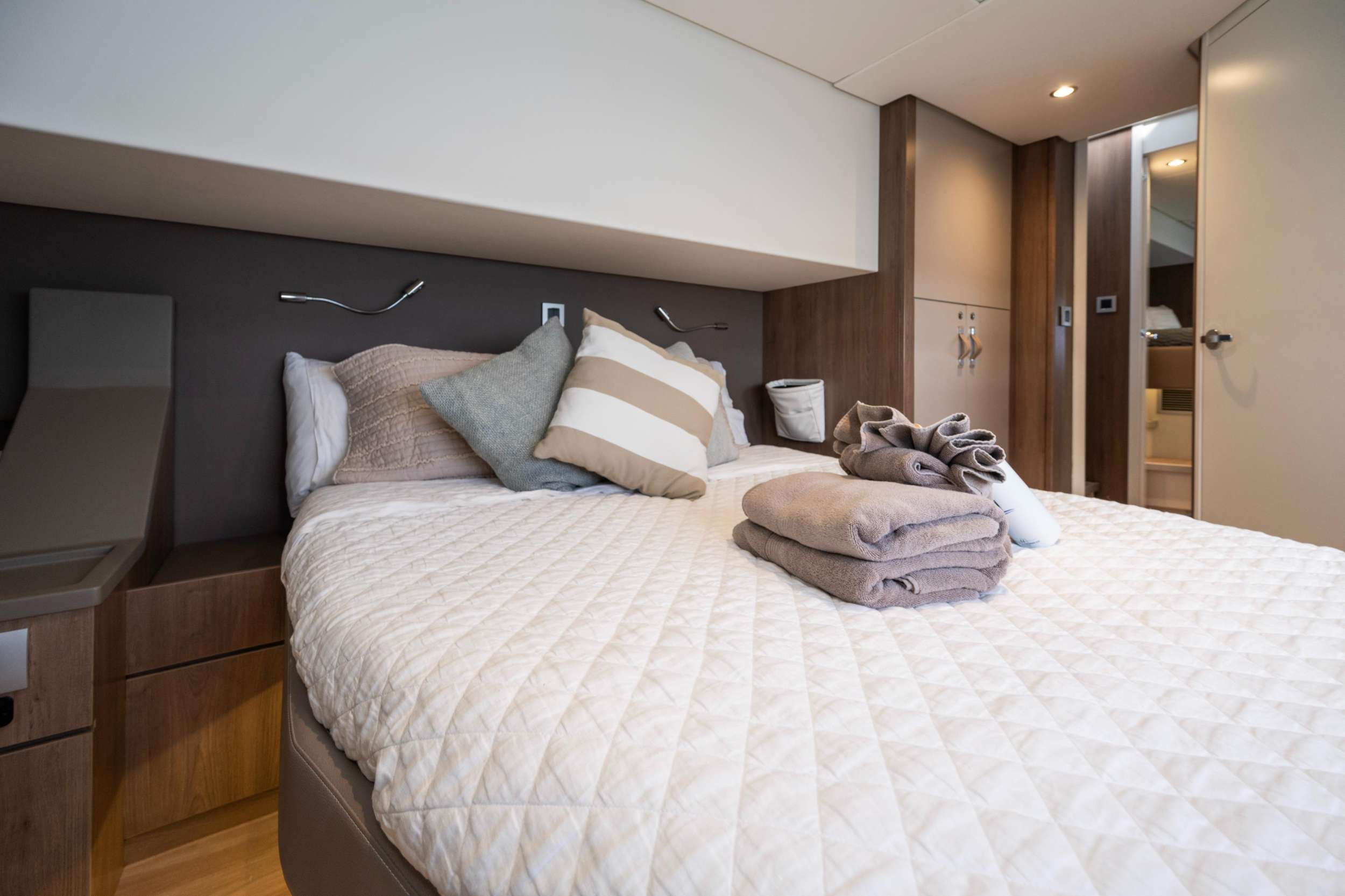 Forward, the traditional trampolines are replaced with a generous lounge area complete with plush cushions—an ideal spot for sunbathing, morning coffee, or sunset cocktails. A full-height door connects this space directly to the salon, allowing effortless movement from bow to stern. The flybridge provides additional seating and sunbathing space, offering panoramic views and a relaxed setting for enjoying the islands from above.