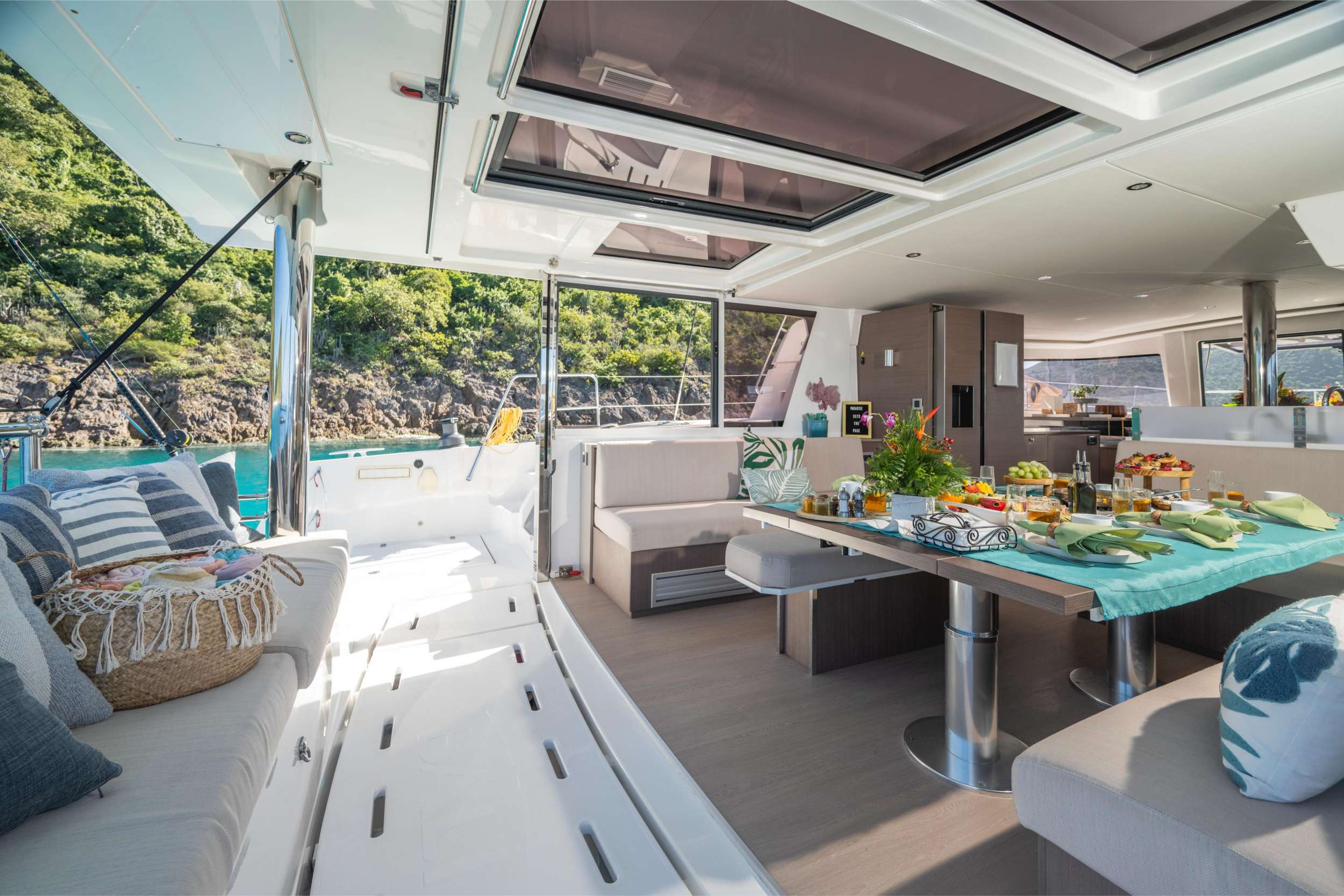 Forward, a spacious foredeck lounge allows sunbathing and relaxation with unobstructed views, while the flybridge offers panoramic vistas, plush seating, and a sunbathing area—perfect for enjoying the vibrant Caribbean scenery from above. The Bali 4.8’s retractable “garage door” aft wall further enhances the connection between indoor and outdoor spaces, creating a fluid and airy environment for entertaining.