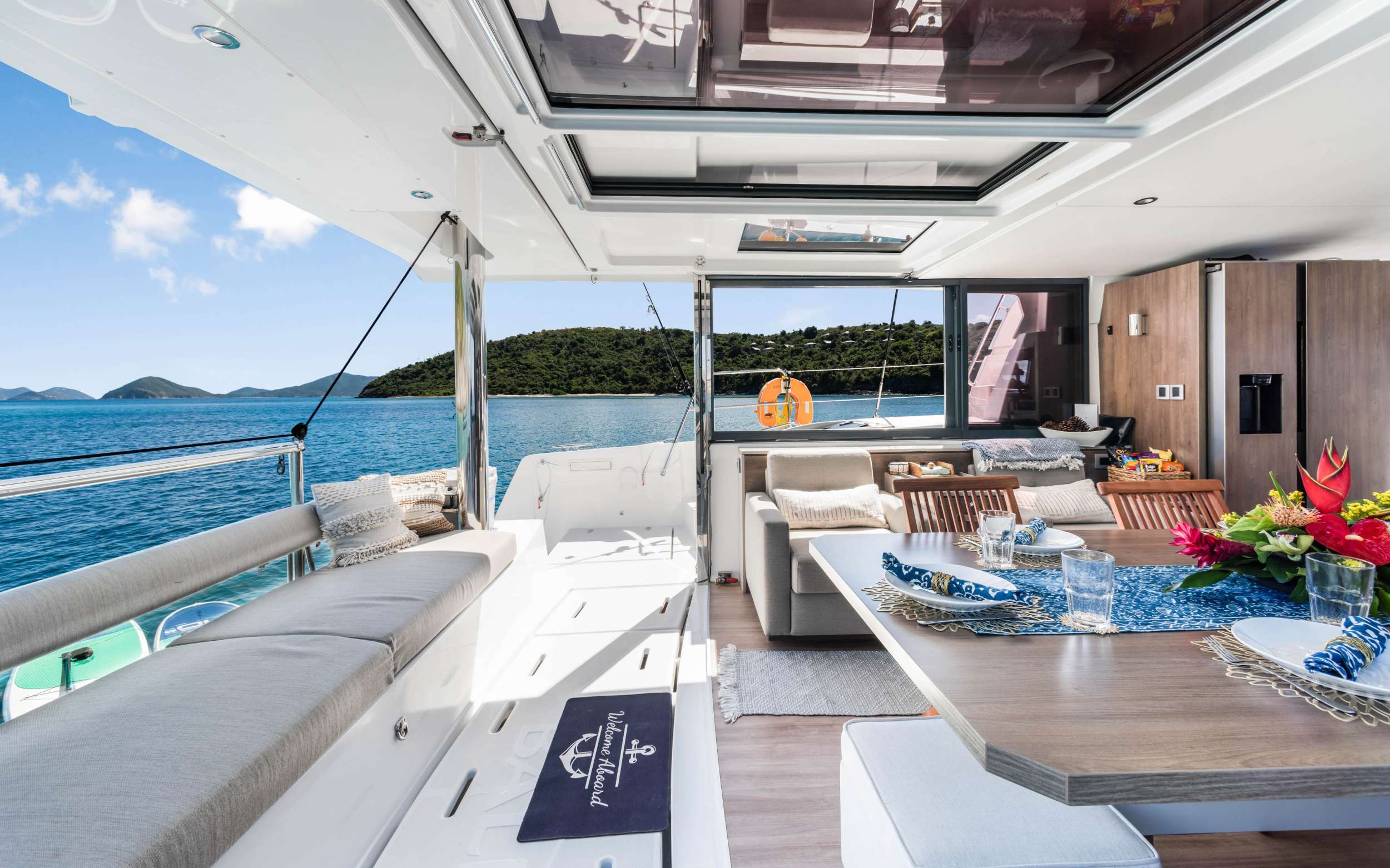 One of KASIOPEJA’s standout features is Bali’s iconic tilt-and-turn rear salon wall, which opens fully to merge the interior saloon with the aft cockpit. In an instant, the yacht transforms into one seamless entertaining space—perfect for relaxed meals, sunset cocktails, or social afternoons at anchor.