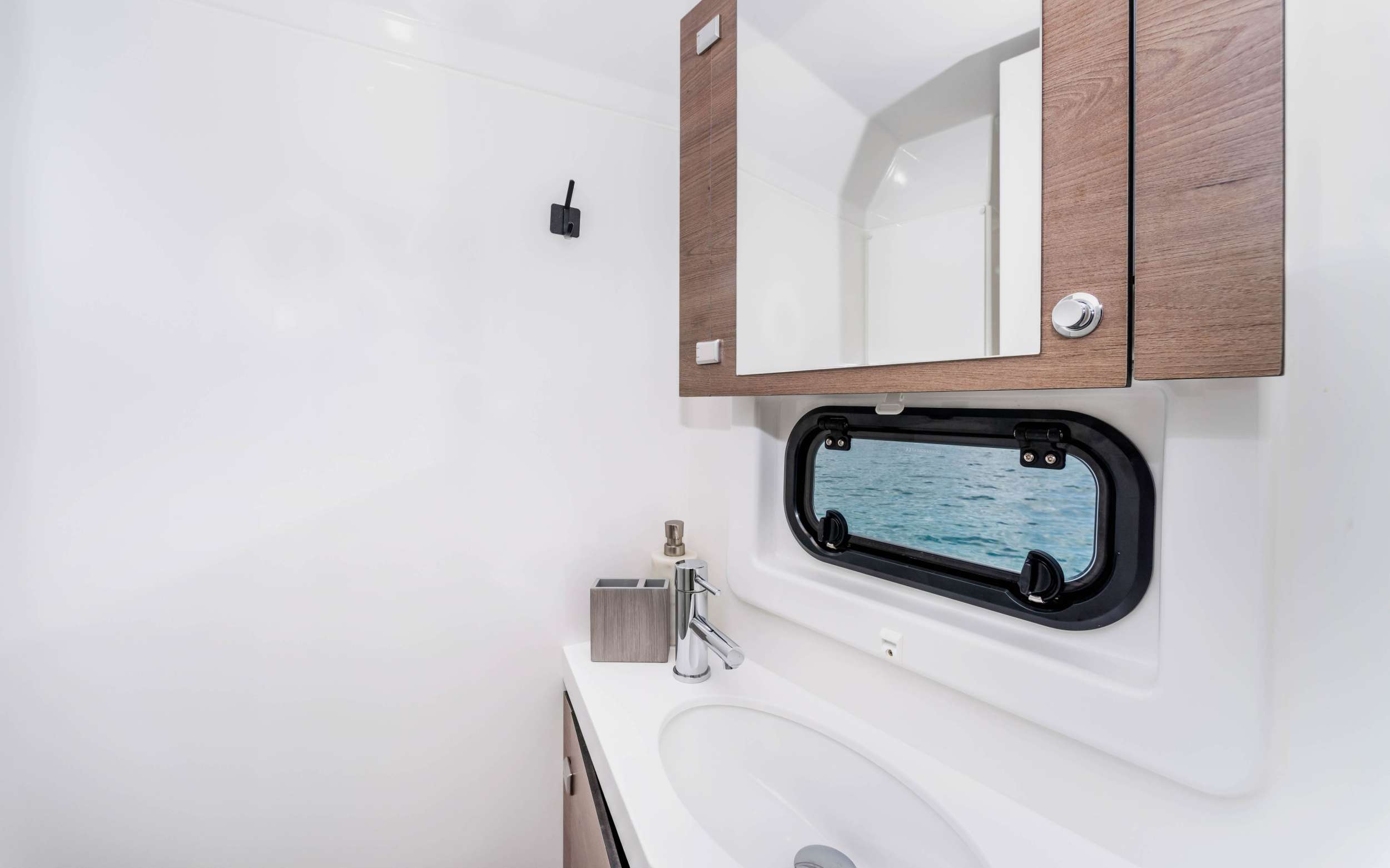 Inside, KASIOPEJA features a modern galley, full-size refrigerator, and smart storage throughout—everything designed to keep life onboard easy and intuitive. Below deck, the four queen cabins are bright, well-ventilated, and thoughtfully arranged, each offering ensuite bathrooms and a calm, private retreat at the end of the day.