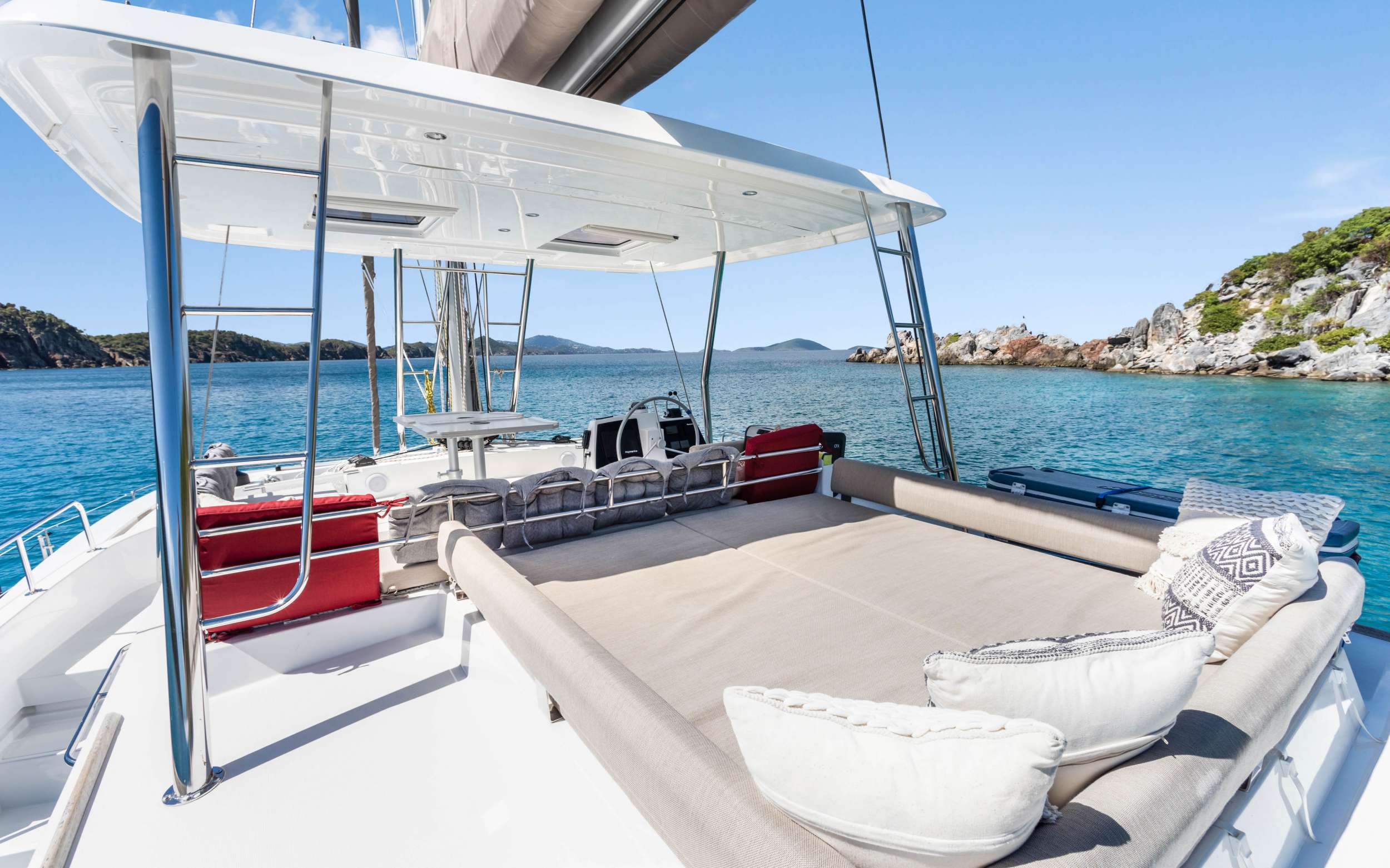 KASIOPEJA is a 2023 Bali 4.8 catamaran offering 4 queen ensuite cabins for 8 guests. With a tilt-and-turn salon wall, solid foredeck lounge, and panoramic flybridge, she delivers Bali’s signature open-air lifestyle at sea.