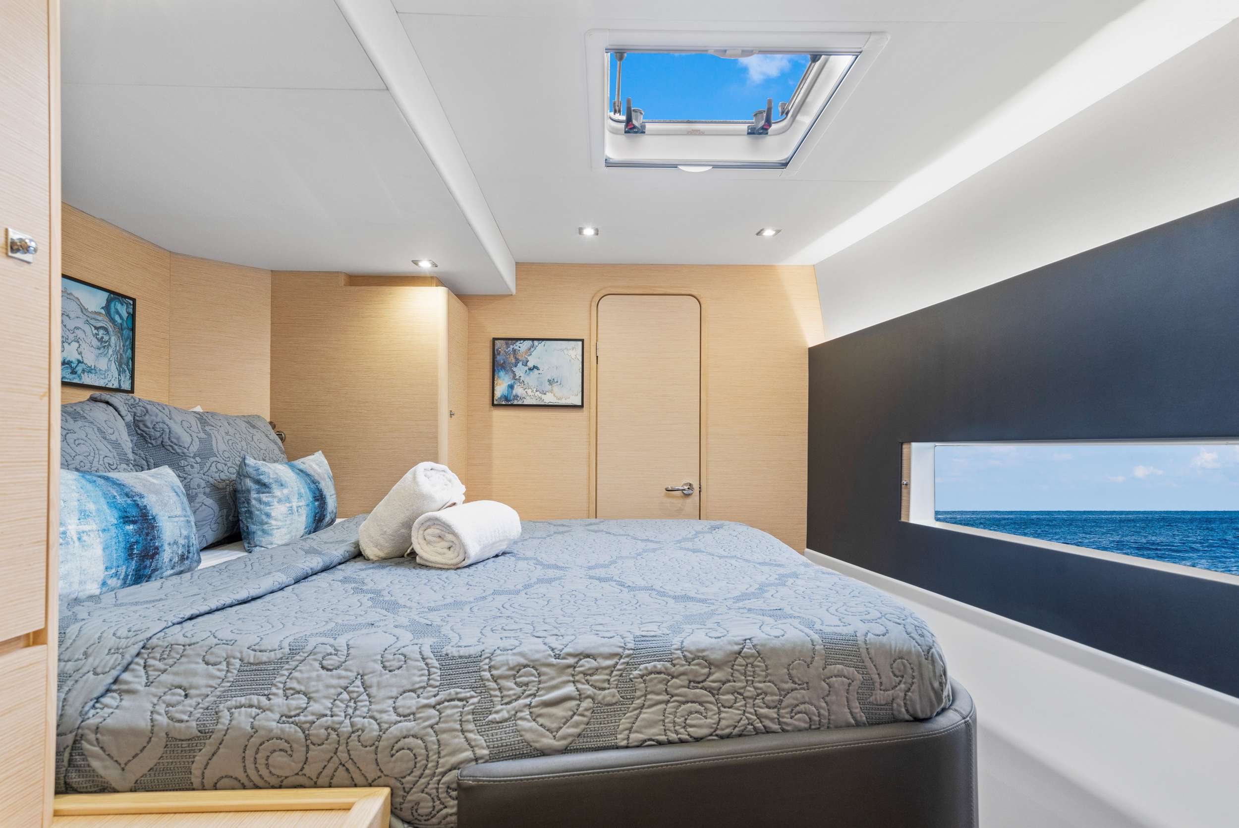 Below deck, four queen cabins provide serene private retreats. Each stateroom features dual-entry access, a private ensuite with separate shower, generous storage, and thoughtfully placed portlights for excellent light and ventilation. Designed for comfort and privacy, these cabins ensure restful nights after full days exploring the coast.