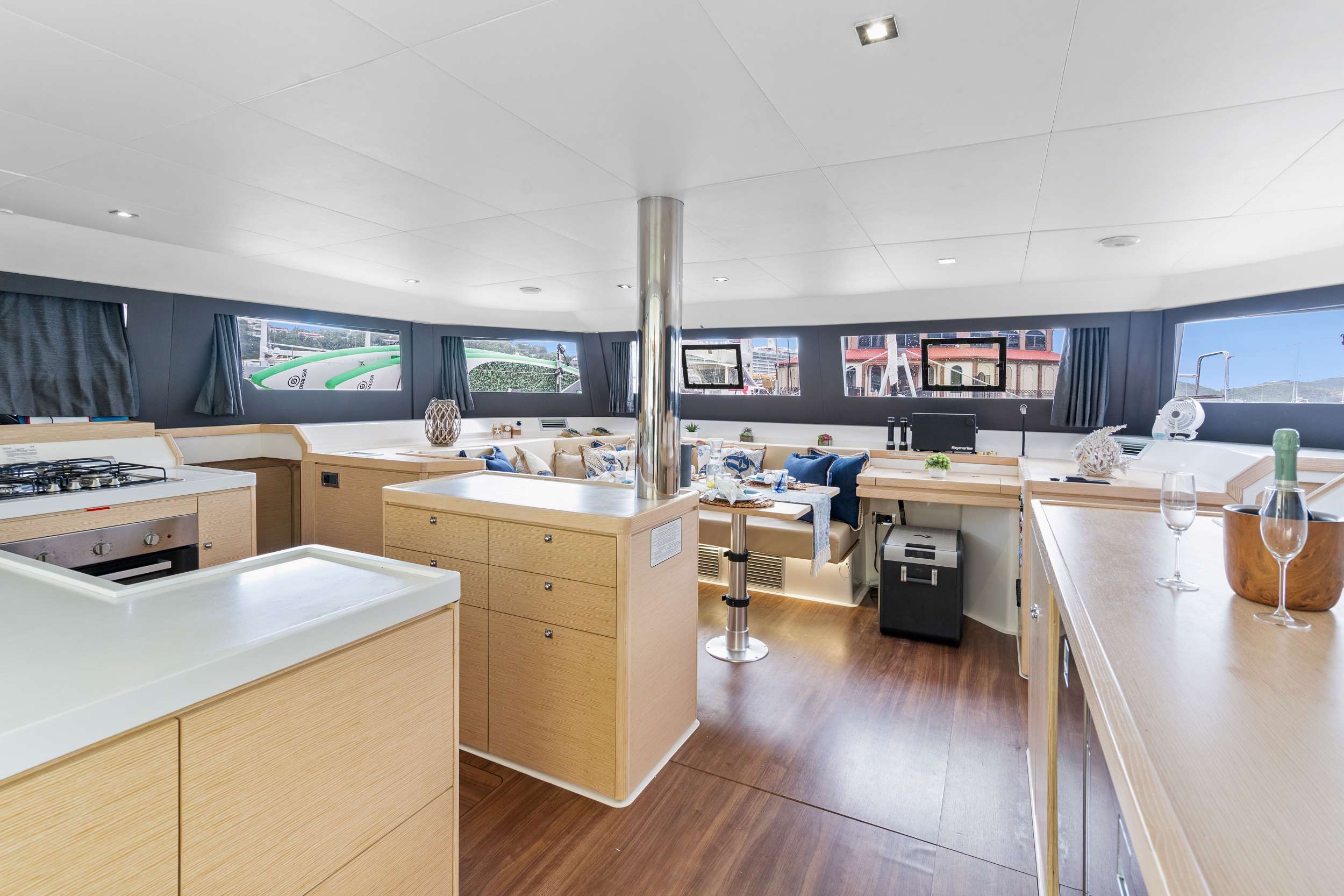 Inside, the open-plan saloon is bathed in natural light thanks to wraparound windows offering a 360-degree sea panorama. The fully equipped ergonomic galley flows naturally toward the cockpit, making entertaining effortless. A versatile sofa-dining area adapts easily from lounge to dining space—or even an additional double berth—adding flexibility to the layout.