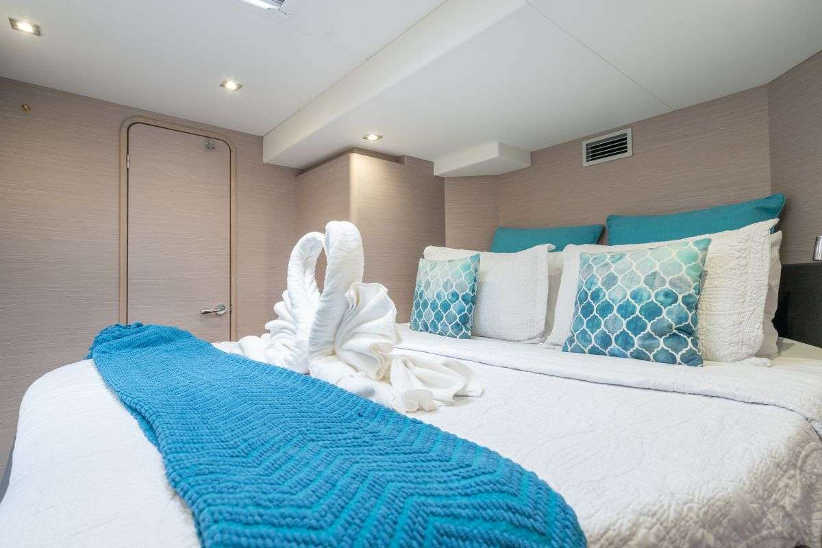Her air-conditioned accommodation includes three queen guest cabins, each with a private en-suite bathroom, plus an additional bunk cabin, allowing SERENITY to comfortably host up to 8 guests. Every space on board is thoughtfully arranged to provide privacy, comfort, and a calming atmosphere after sun-filled days on the water.