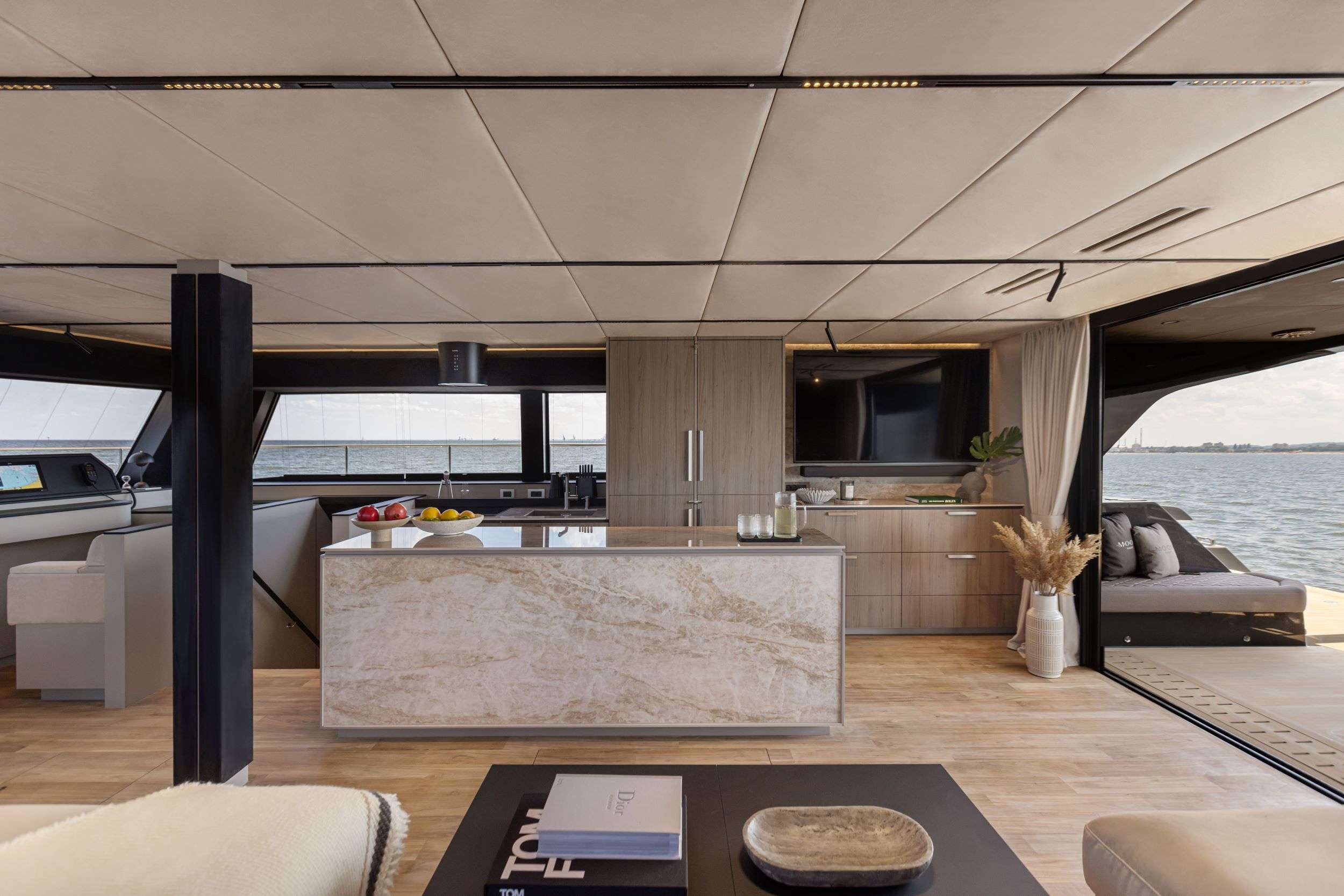 Her contemporary interior is a masterclass in understated sophistication. Flooded with natural light, the expansive living spaces feature premium materials, bespoke finishes, and a calm, neutral palette that creates a serene onboard atmosphere. Thoughtfully designed for both relaxation and socialising, TRYST offers generous lounging areas that flow seamlessly throughout the yacht—perfect for unwinding after a day exploring the BVI.