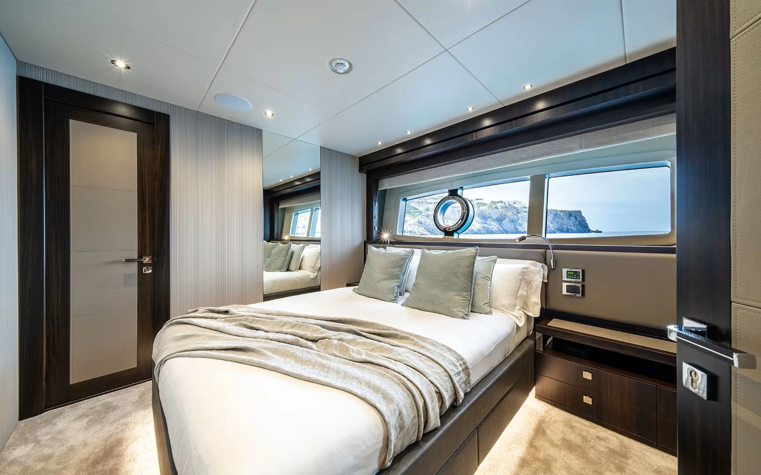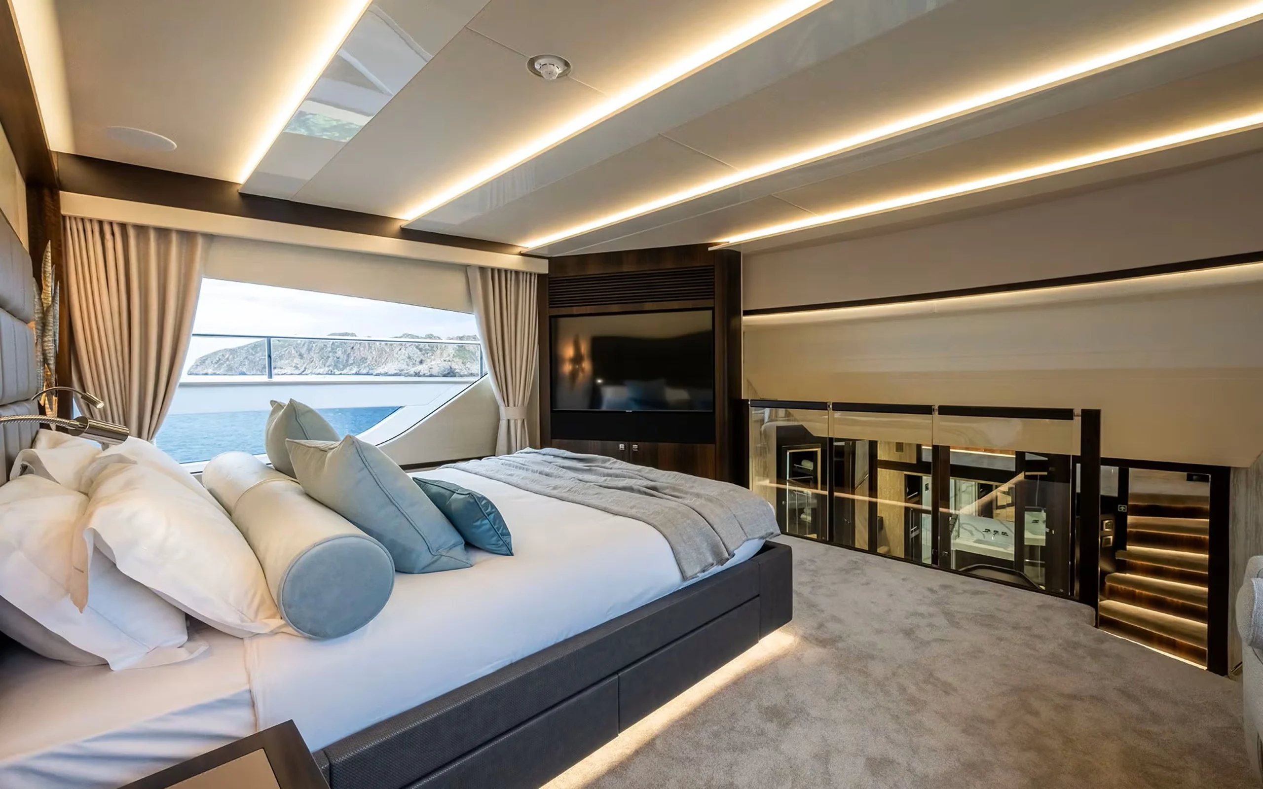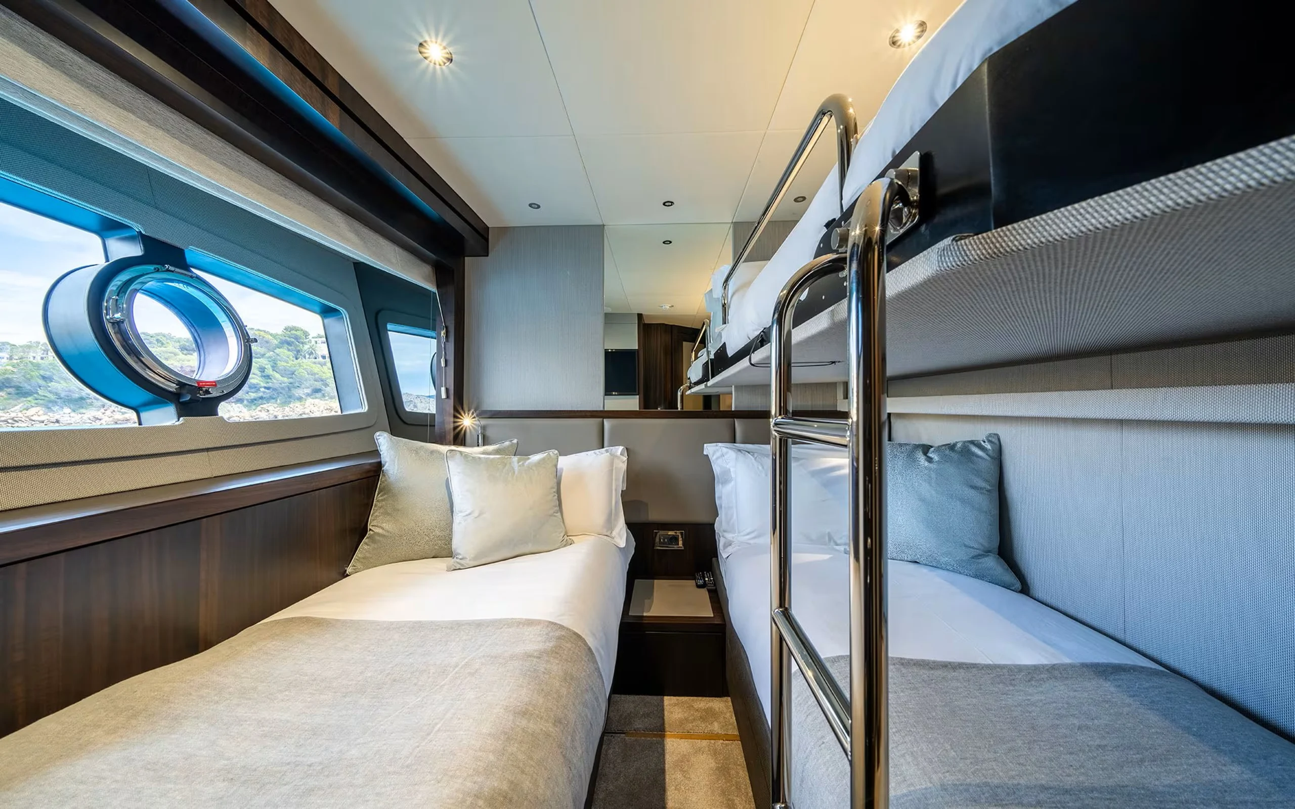 She accommodates up to 12 guests across 5 beautifully appointed staterooms, including a spectacular tri-level master suite on the main deck — a standout feature that offers privacy, architectural interest, and a true sense of occasion. The remaining guest cabins are equally refined, making her particularly well suited to extended families or larger charter groups seeking both comfort and space.