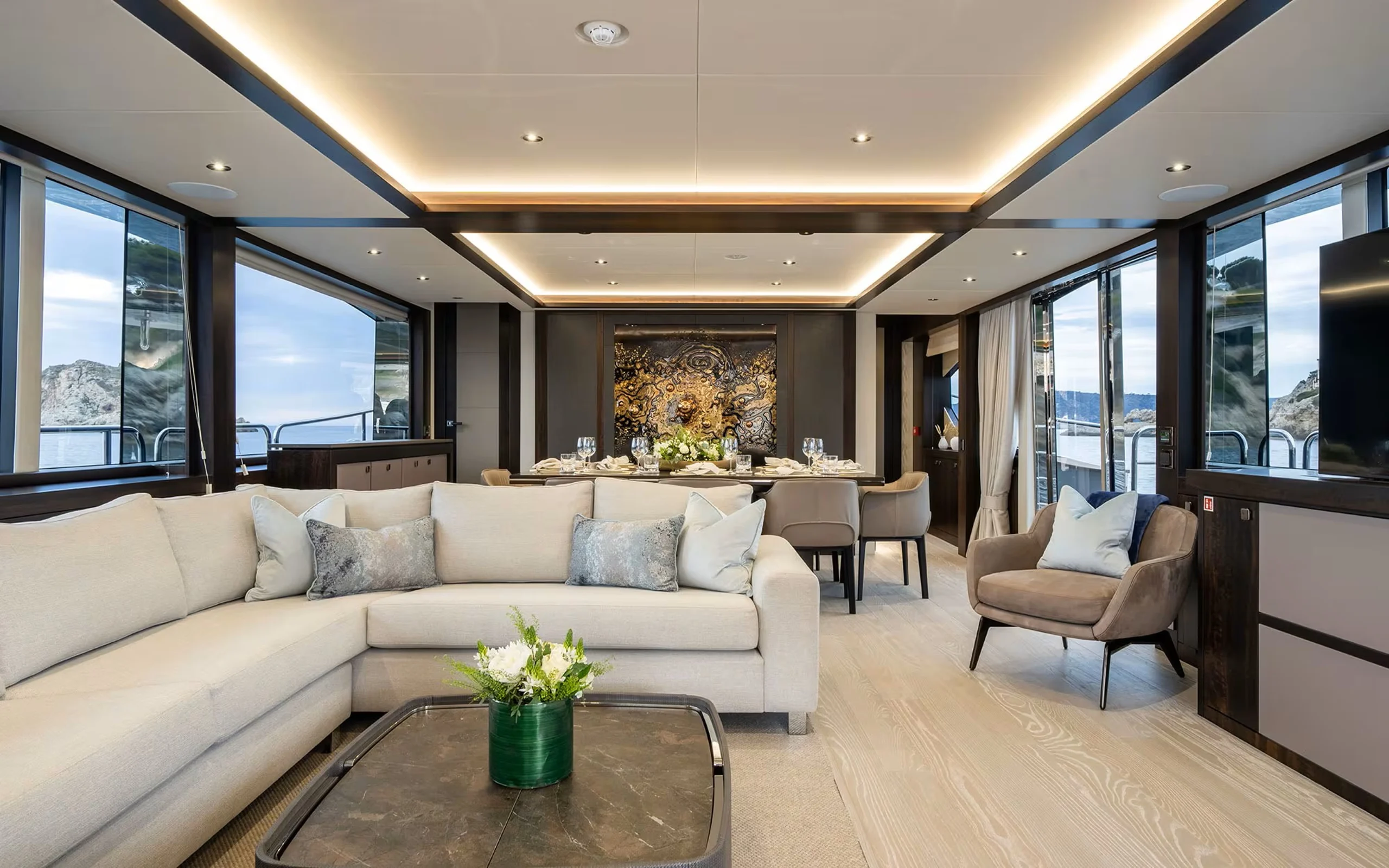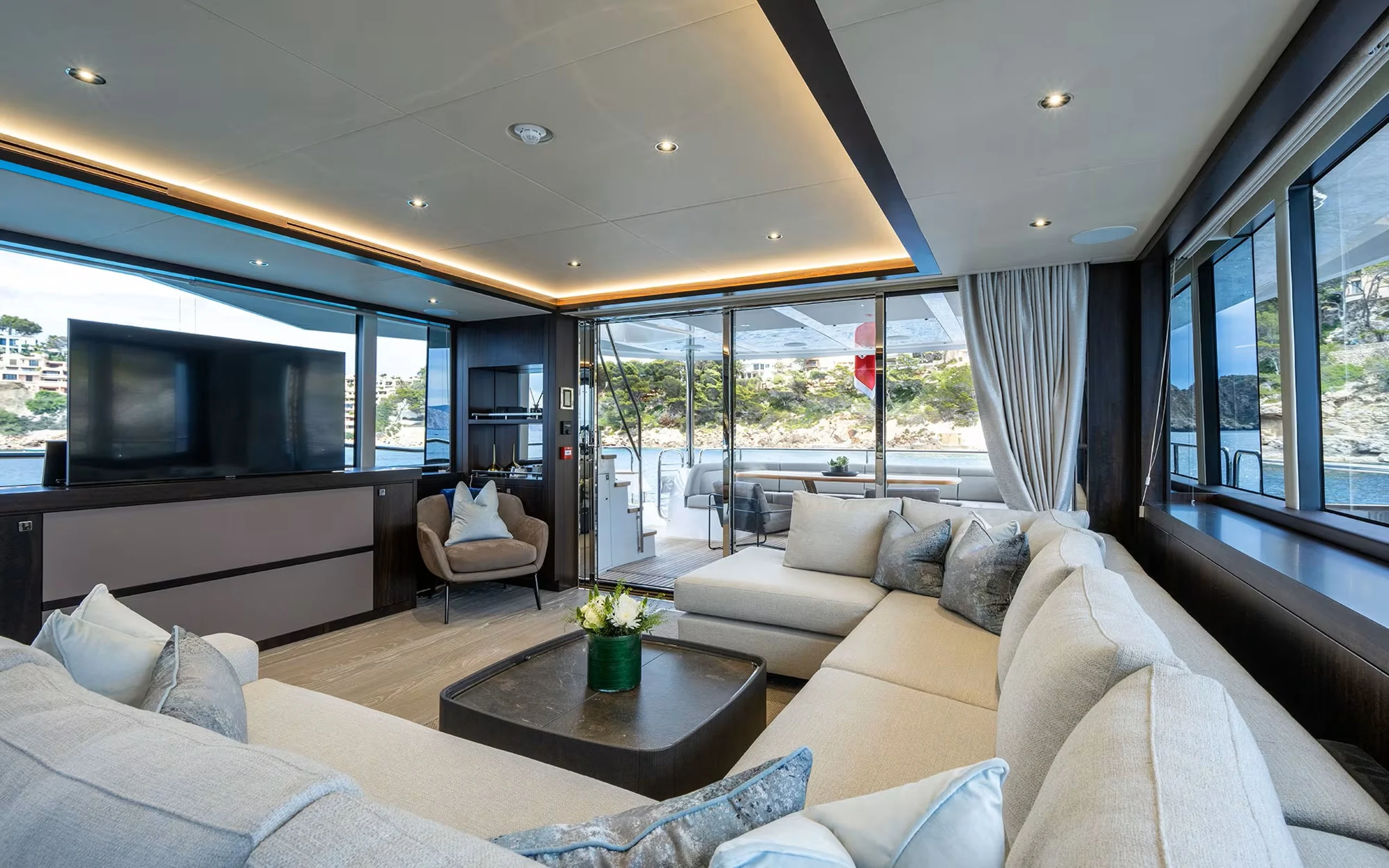 Inside, HIGH ENERGY boasts a light-filled and spacious salon, seamlessly connected to an elegant dining area designed for relaxed formal dinners or lively evenings with friends. Large windows invite natural light throughout, enhancing the yacht’s open and welcoming atmosphere.