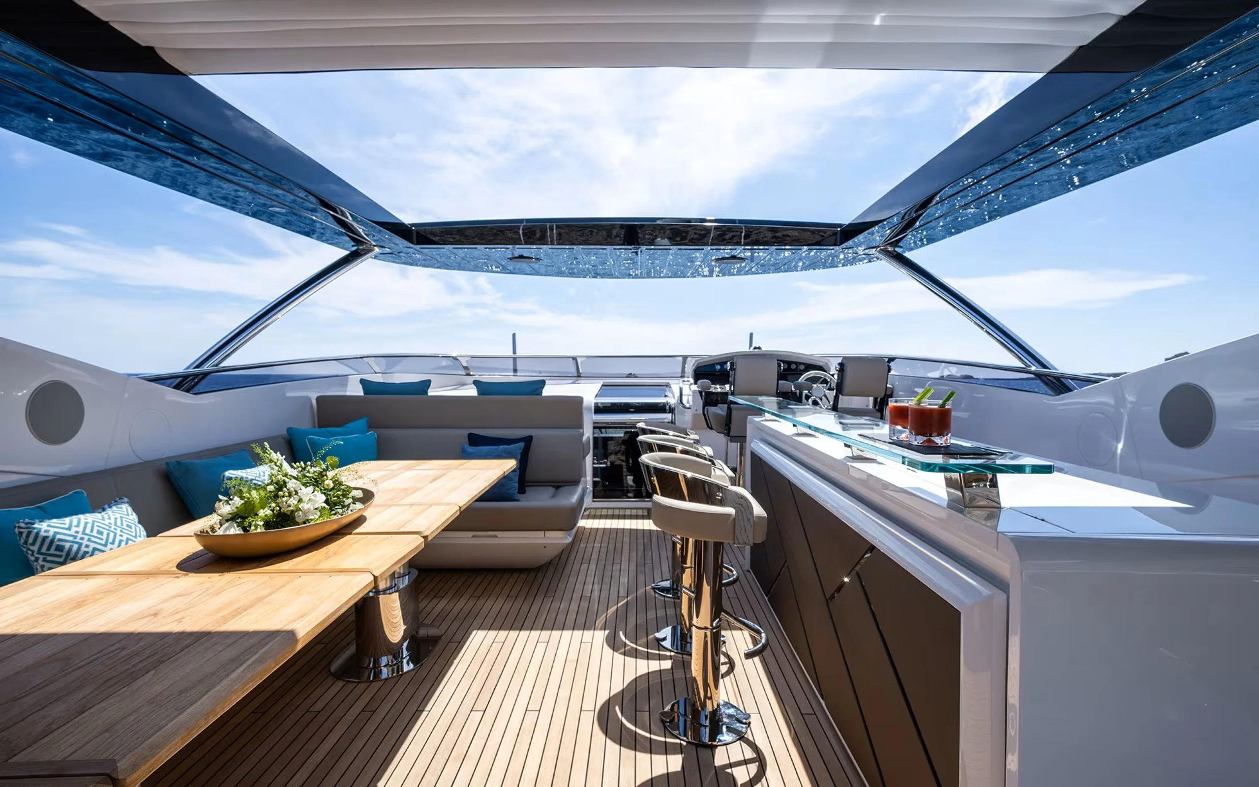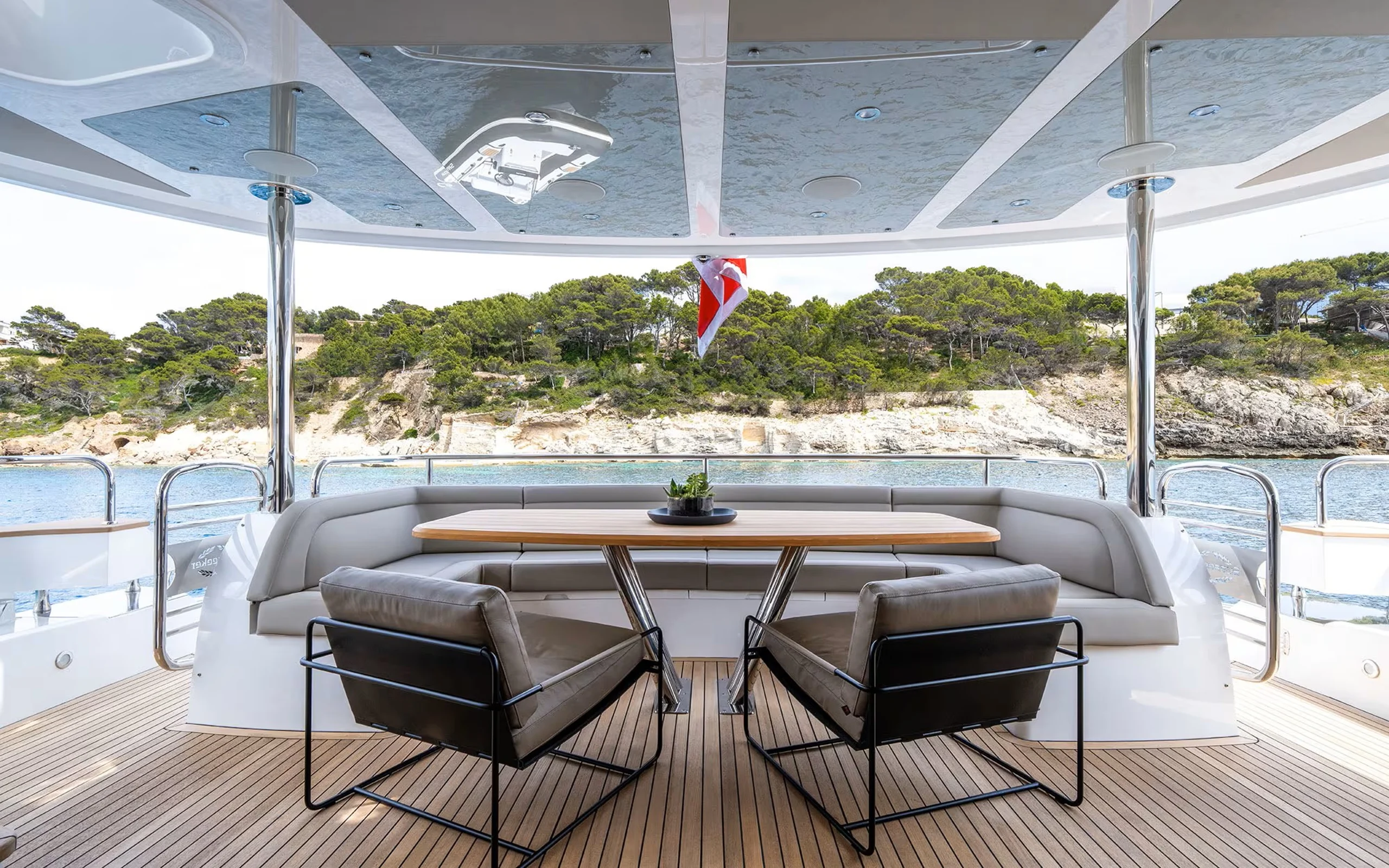 On the main deck aft, guests can enjoy additional open-air dining, while the generous foredeck sun lounging area offers a more tranquil retreat for soaking up the Mediterranean sunshine.